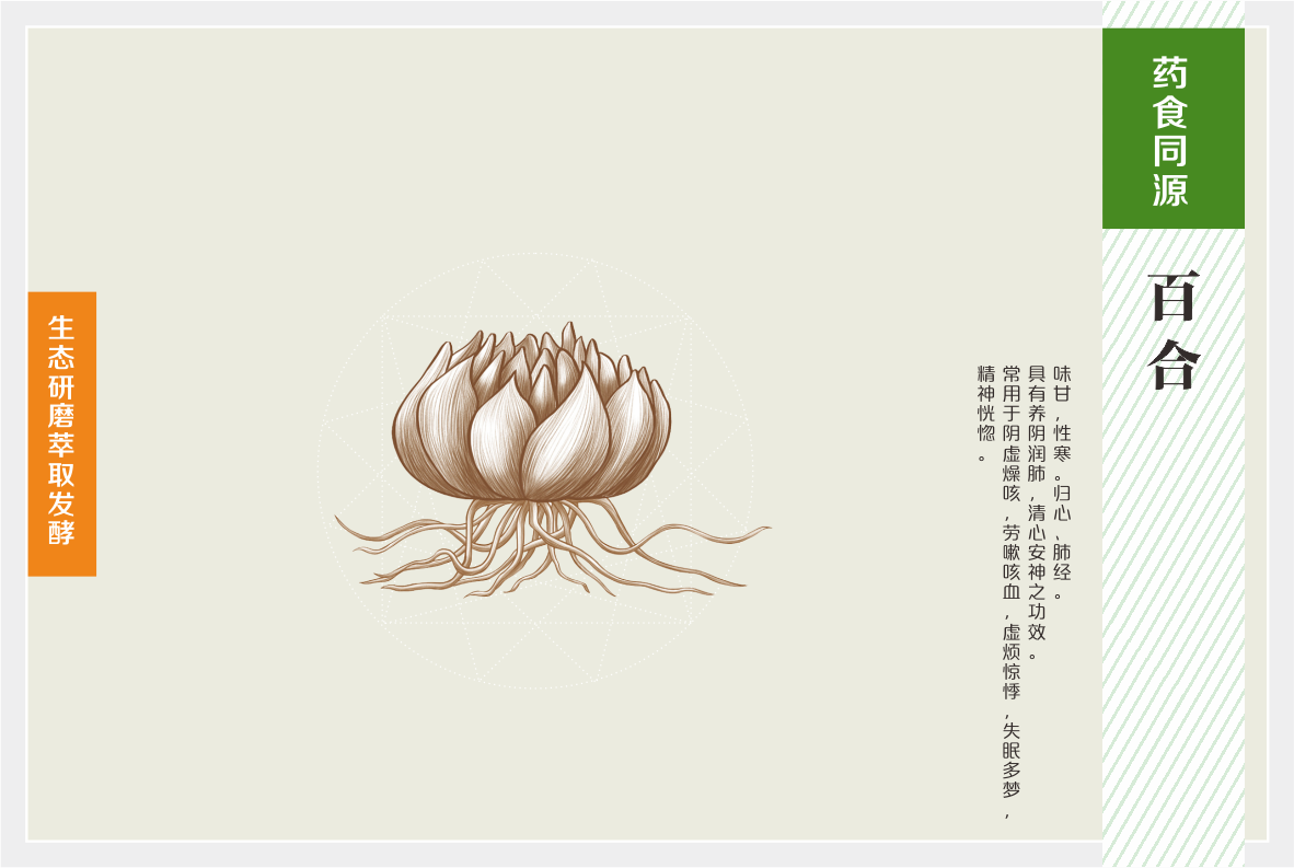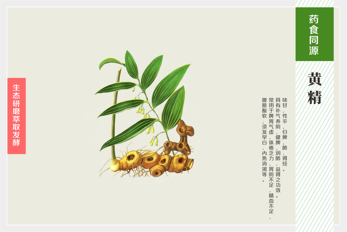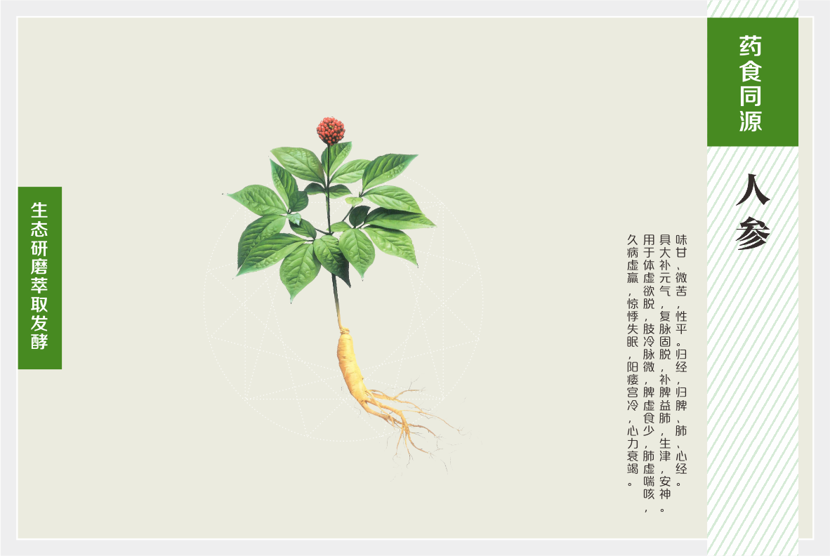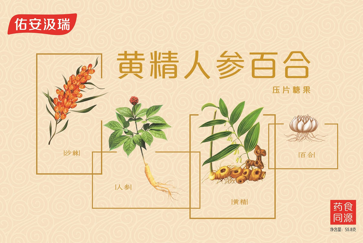 “黄精人参百合压片糖果”源于药食同源医理,结合自然医学,将黄精、人参(人工种植)、葛根、沙棘、百合等用传统中医工艺经过甄选、 脱水、磨粉、发酵后制作而成,是养护及复原人体自身机能的功能性食品,修复未病,逆转亚健康;非药物治疗,改善原发性高血压值。