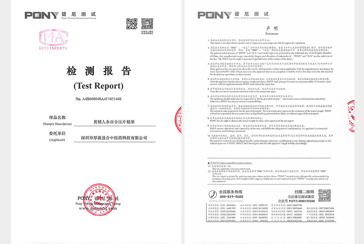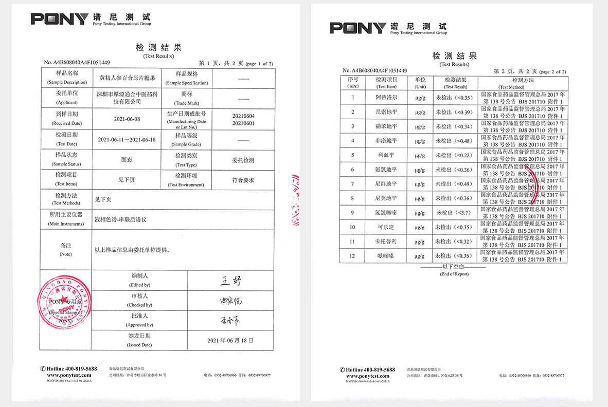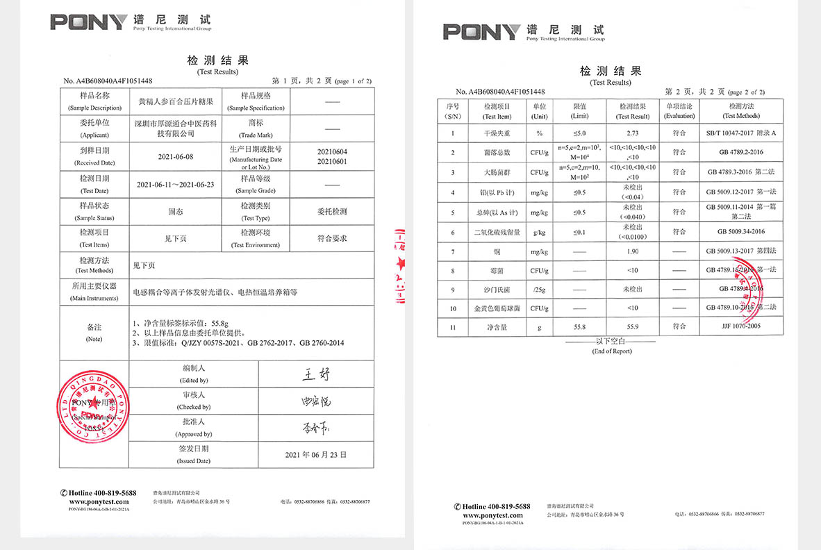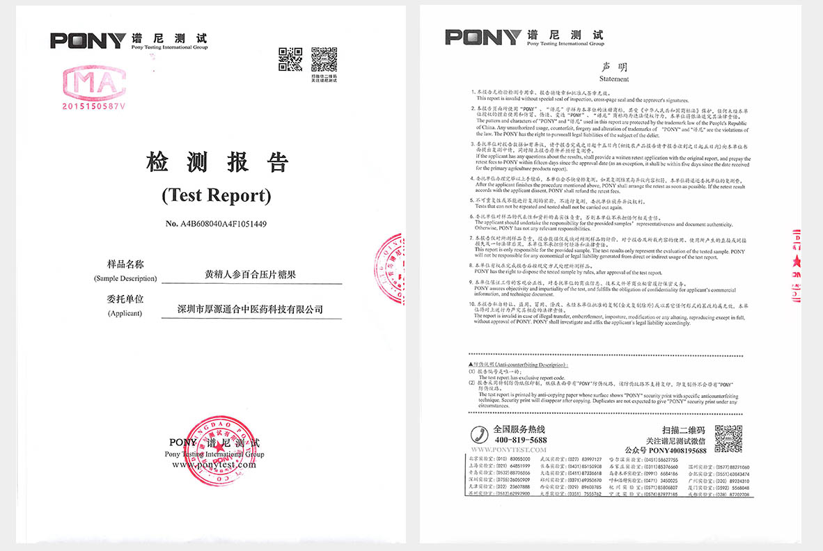 黄精人参百合片从原料采集到成品出厂,均由国家许可的检测机构出具合格检测报告。它以修复身体机能为目的,随 着食用的时间越长,身体机能恢复得就越好,用量也会随之越来越少,直至无需食用。
